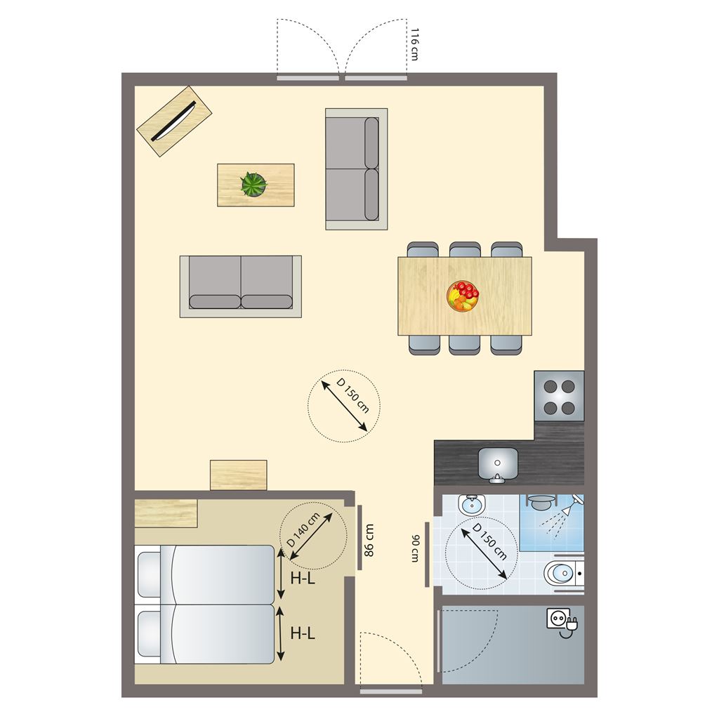 - Salle de bain adaptée avec douche à l'italienne, barres de soutien dans la zone de douche, chaise de douche avec accoudoirs, toilettes surélevées avec barres de soutien, lavabo de 78 cm minimum de hauteur sous lequel peut se glisser un fauteuil roulant et espace de manœuvre de 150 cm minimum