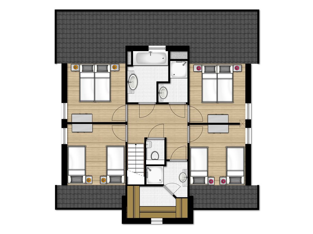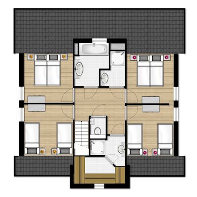 • Quatre chambres à coucher avec deux lits boxspring pour 1 personne au premier étage