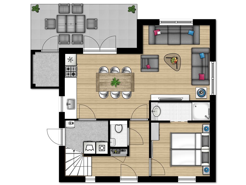 - Salle de bain ouverte sur la chambre avec cabine de douche et lavabo au au rez-de-chaussée